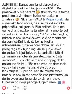 “Noro dobra izkušnja. In tok fajn filing, da se ljudje lahko programu priključijo kadarkoli. Nobenih omejitev – samo čista svoboda.”